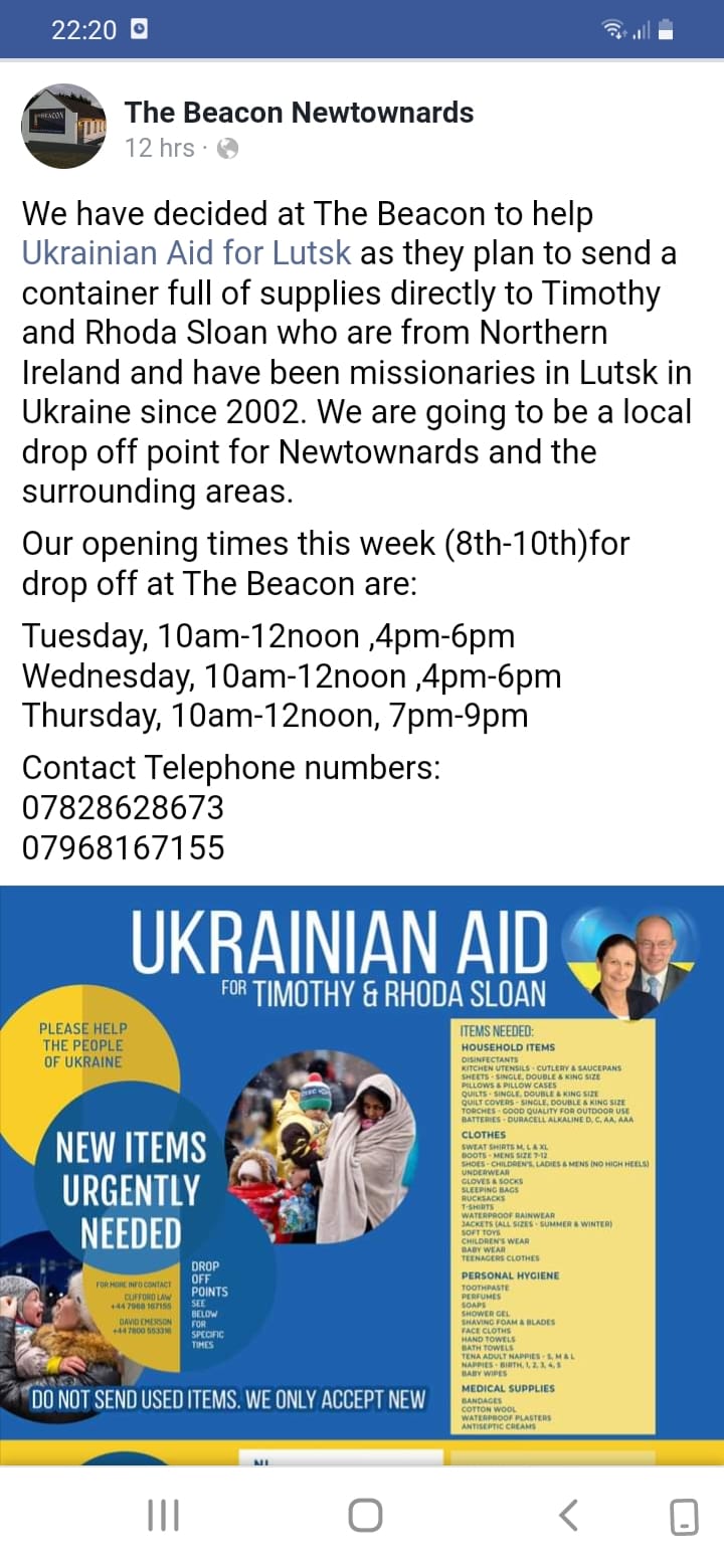 Continued support for Northern Irish missionaries to Ukraine needed. Share this:Tweet Click to email a link to a friend (Opens in new window) Email Click to share on Telegram (Opens in new window) Telegram Click to share on WhatsApp (Opens in new window) WhatsApp More Click to print (Opens in new window) Print Share on TumblrPocketLike Loading... Published by Ards & North Down Christian Community Hub View all posts by Ards & North Down Christian Community Hub