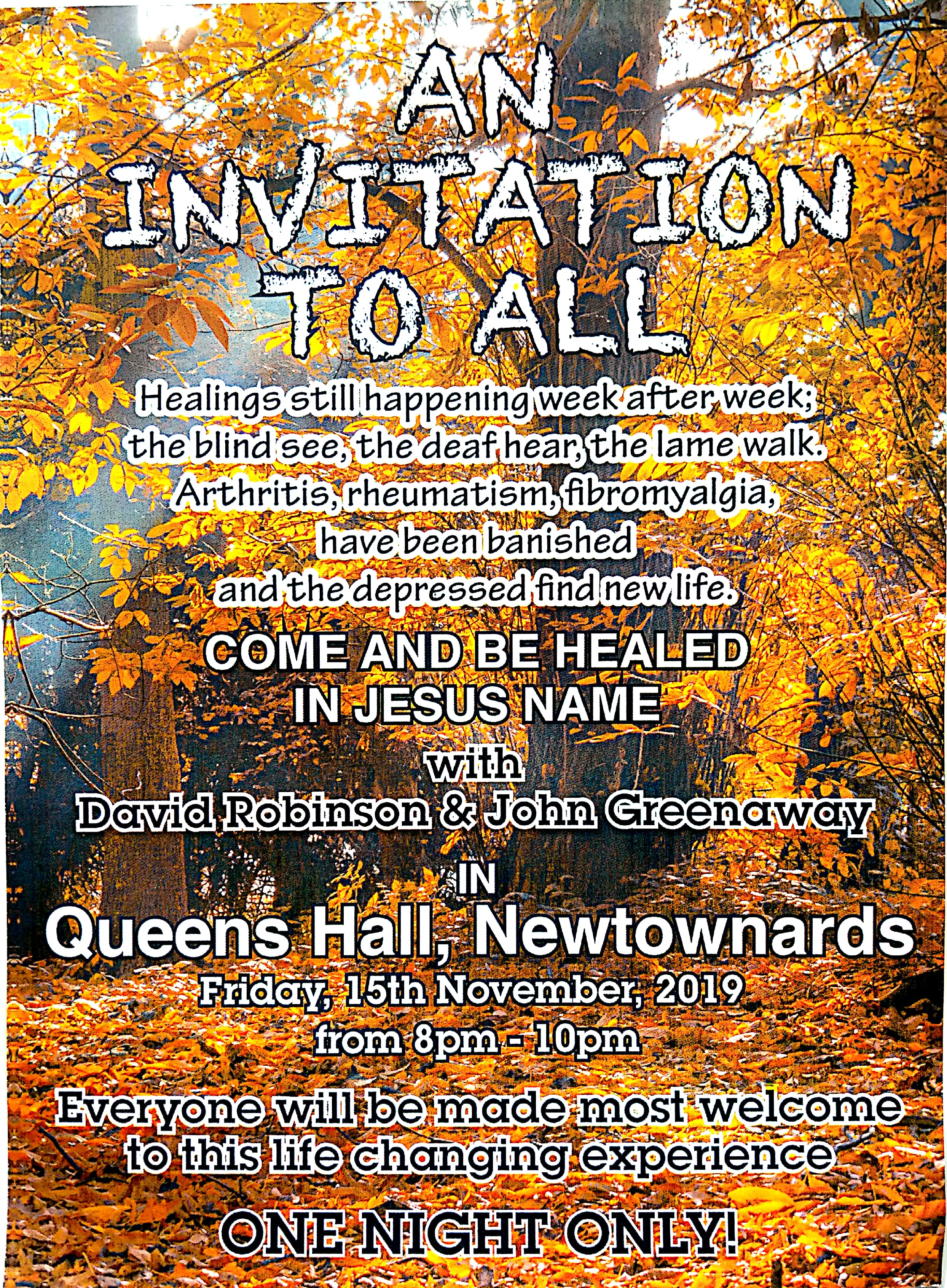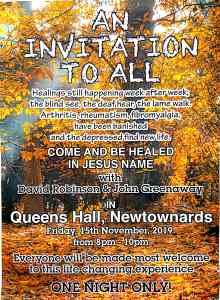 Having communicated with David Robinson and the team that were ministering to those that came forward for prayer last Friday night at the Queens Hall I am thrilled to report that two people received Salvation and at least one was restored to the Lord. Quite a few were healed of physical problems and a lot with anxiety and depression were ministered to.